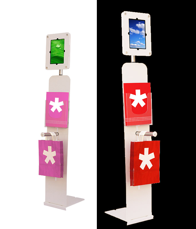 Nouveau contact modèle 2019 de Fastand. Facile à transporter grâce à la valise rigide. Tête du support tablette pivotante. Peinture blanc total. Support tablette universel.
