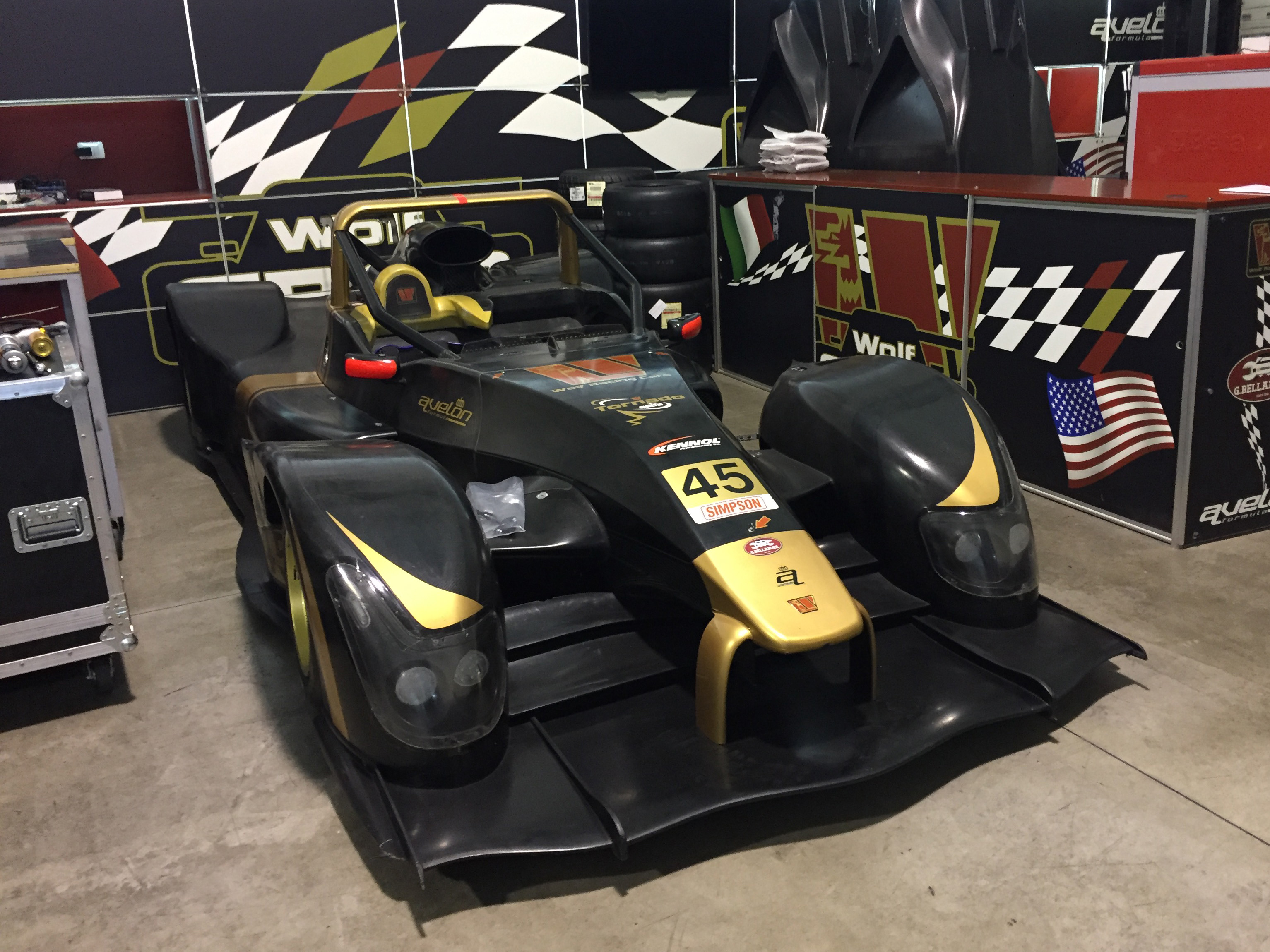 Box automobile pour Avelon Formula. Stand box permanent, complet avec portes ouvrantes pour stocker le matériel, plans d’appui et fond graphique pour la présentation du véhicule. Impact esthétique très sportif et important.
