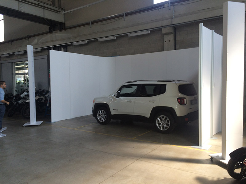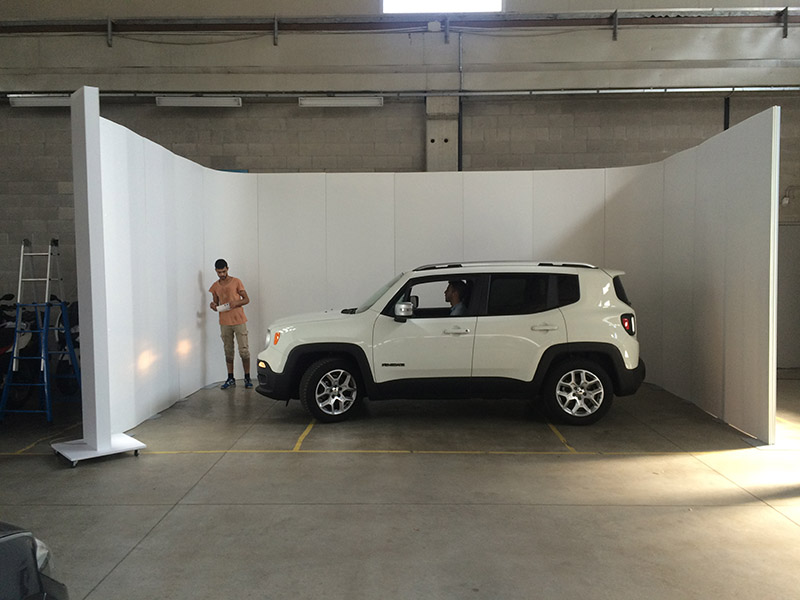 Ce décor photographique est modulable, ce qui permet d’y faire entrer une voiture pour la photographier. Les lumières LED sont également montées sur roulettes.