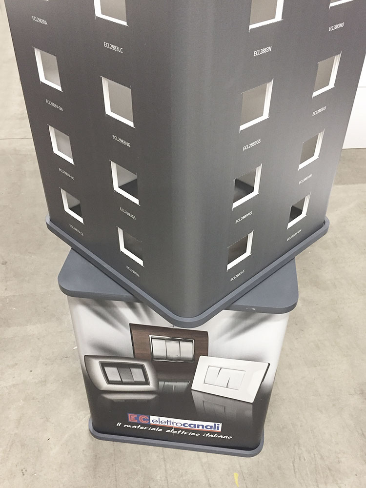 Une solution pratique et innovante, même en grand format, avec une hauteur de 200 cm et un système de rotation de la partie supérieure permettant une meilleure visibilité de la gamme de produits. Simple à monter et entièrement graphique, ce présentoir portable est doté de perforations permettant d’y insérer les plaques électriques exposées.